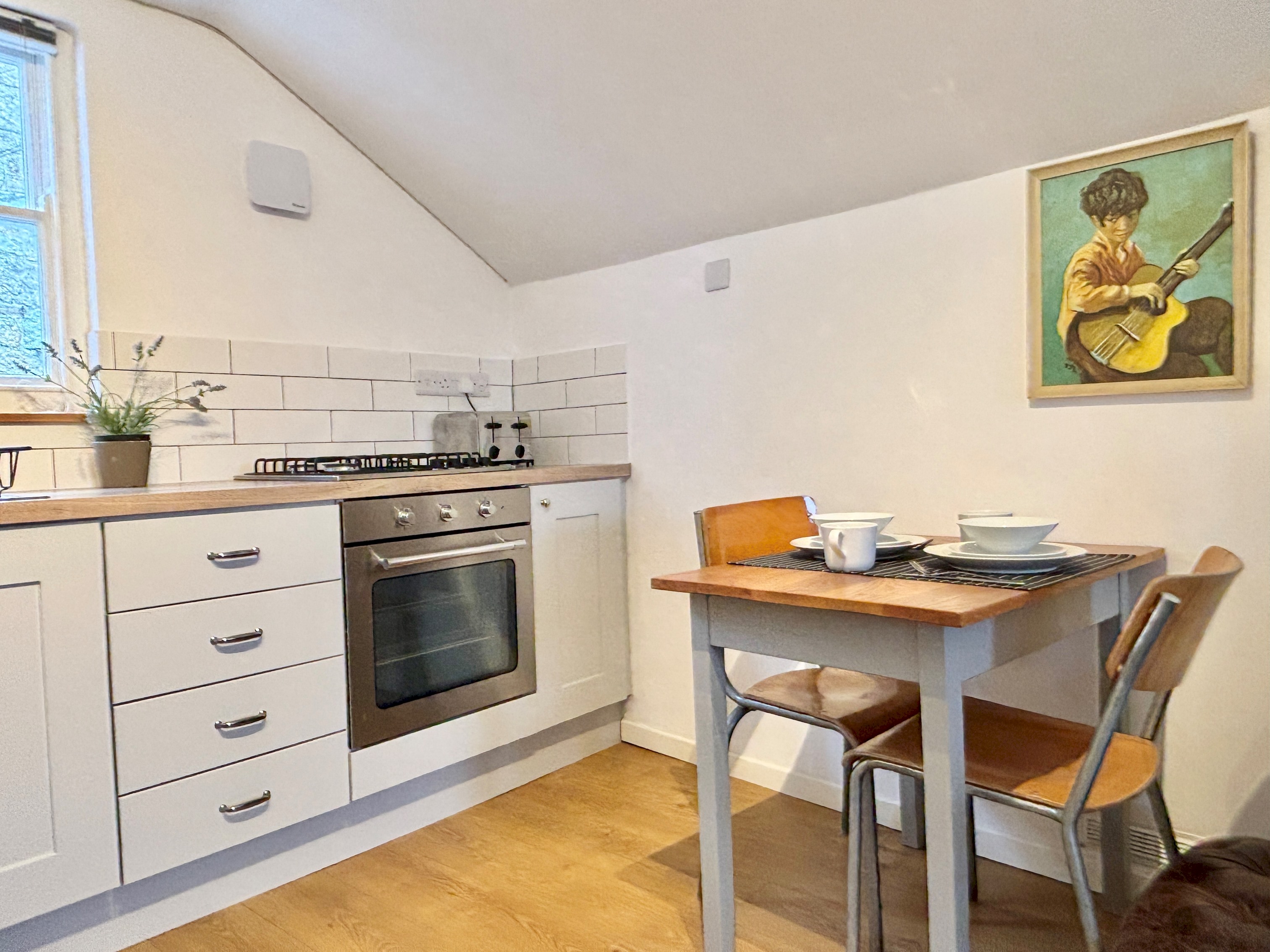 The Coach House was completely renovated in April 2019. It has central heating and a real flame gas fire for cosy nights after that winter coastal walk. The kitchen has gas hob, full size electric oven, fridge and microwave cooker. There is wifi and flat screen TV. The bedroom has a king size bed (150×200) and pocket sprung mattress. The shower room/WC is through an oak sliding door with lowish threshold. You have to duck to go in as it wasn’t permitted to alter the historic fabric of the building. For a small building built to house a pony and trap downstairs and the driver/handyman upstairs its a bright, jolly and very warm place to stay. Parking for a normal car is in front of the main house – you just have to walk around a 5 house little terrace to reach the Coach House.